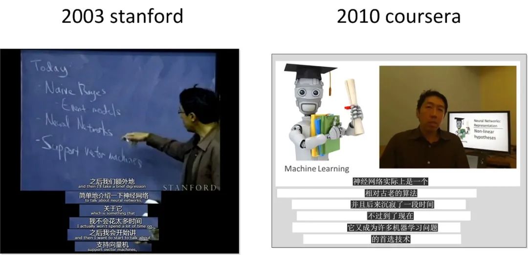 但是,需要注意点是,这两个课程对待神经网络的态度有点不同。早些的课程一共有20节课,Ng花了若干节课去专门讲SVM以及SVM的推导,而当时的神经网络,仅仅放了几段视频,花了大概不到20分钟(一节课60分钟左右)。而到了后来的课程时,总共10节的课程中,Ng给了完整的两节给神经网络,详细介绍了神经网络的反向传播算法。同时给SVM只有一节课,并且没有再讲SVM的推导过程。下面两张图分别是Ng介绍神经网络的开篇,可以大致看出一些端倪。