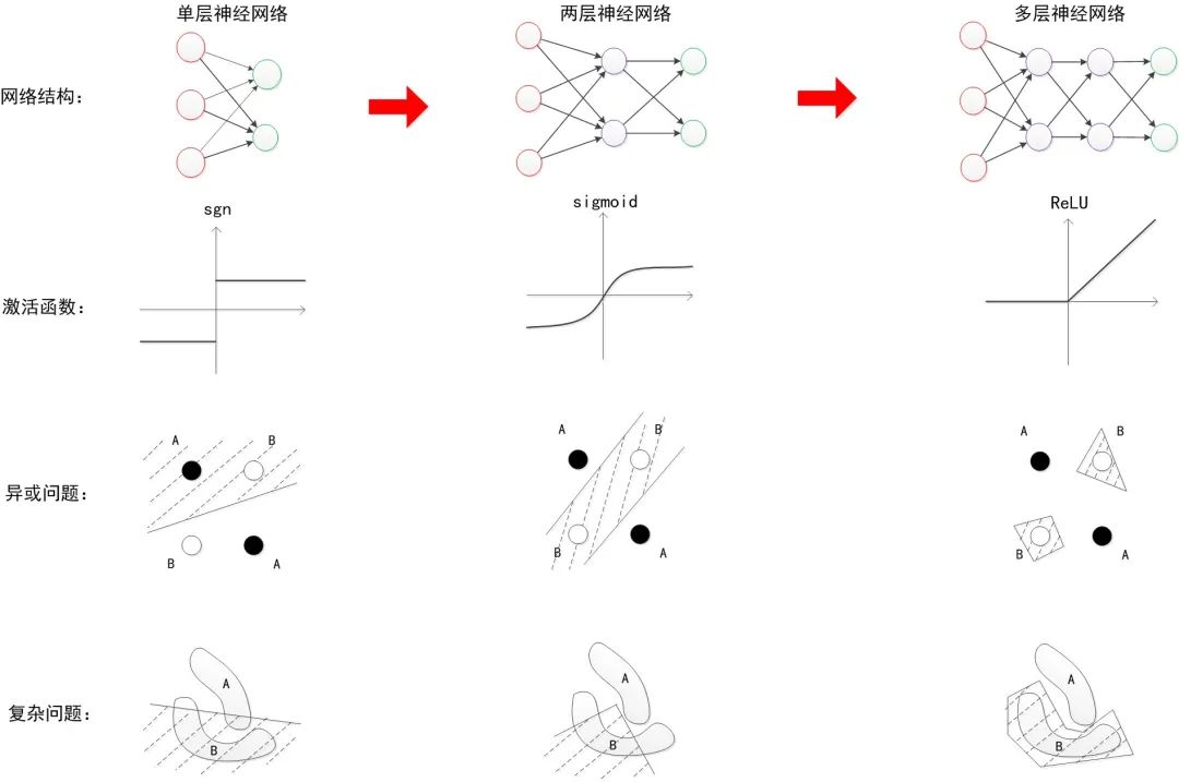 从单层神经网络(感知器)开始,到包含一个隐藏层的两层神经网络,再到多层的深度神经网络,一共有三次兴起过程。详见下图。