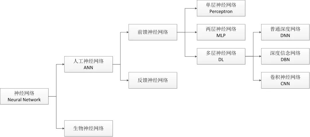 其实本文的名字“神经网络浅讲”并不合适,因为本文并不是讲的是“神经网络”的内容,而是其中的一个子类,也是目前最常说的前馈神经网络。根据下图的分类可以看出。
