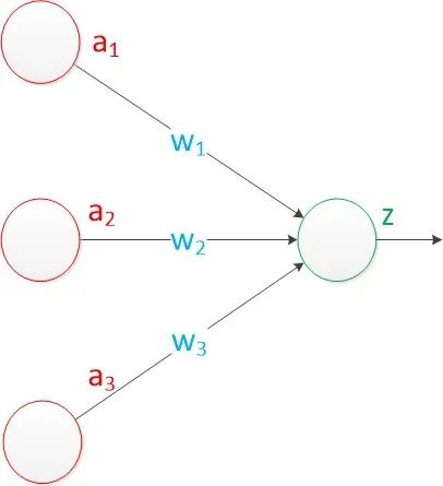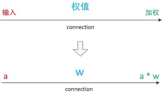 我们使用a来表示输入,用w来表示权值。一个表示连接的有向箭头可以这样理解:在初端,传递的信号大小仍然是a,端中间有加权参数w,经过这个加权后的信号会变成a*w,因此在连接的末端,信号的大小就变成了a*w。