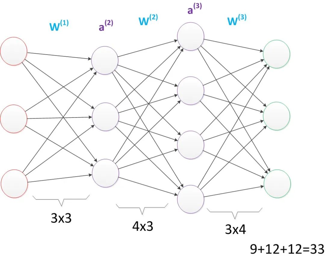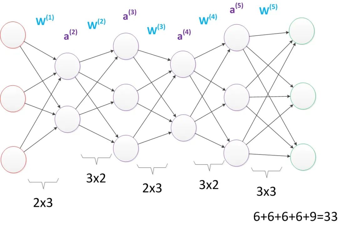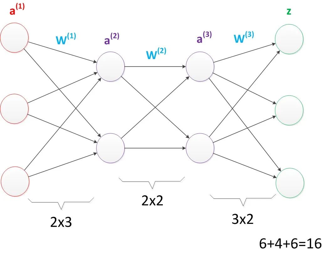 首先我们看第一张图,可以看出W(1)中有6个参数,W(2)中有4个参数,W(3)中有6个参数,所以整个神经网络中的参数有16个(这里我们不考虑偏置节点,下同)。