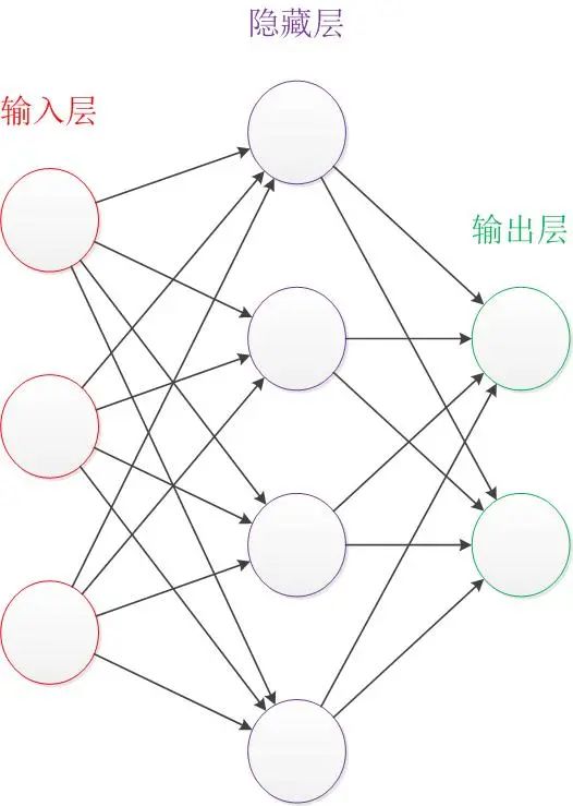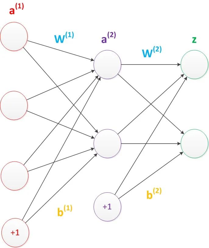 让我们来看一个经典的神经网络。这是一个包含三个层次的神经网络。红色的是输入层,绿色的是输出层,紫色的是中间层(也叫隐藏层)。输入层有3个输入单元,隐藏层有4个单元,输出层有2个单元。后文中,我们统一使用这种颜色来表达神经网络的结构。