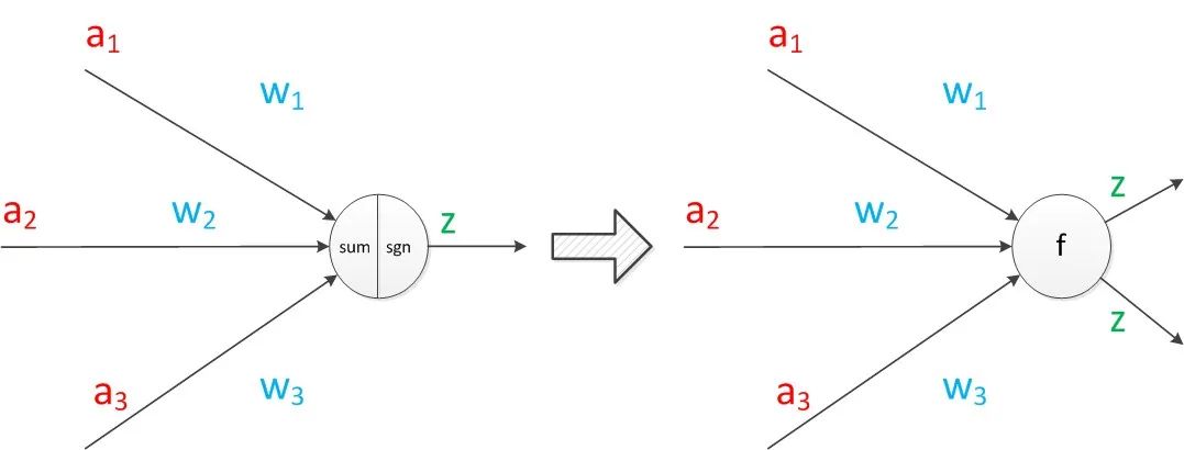 下面对神经元模型的图进行一些扩展。首先将sum函数与sgn函数合并到一个圆圈里,代表神经元的内部计算。其次,把输入a与输出z写到连接线的左上方,便于后面画复杂的网络。最后说明,一个神经元可以引出多个代表输出的有向箭头,但值都是一样的。