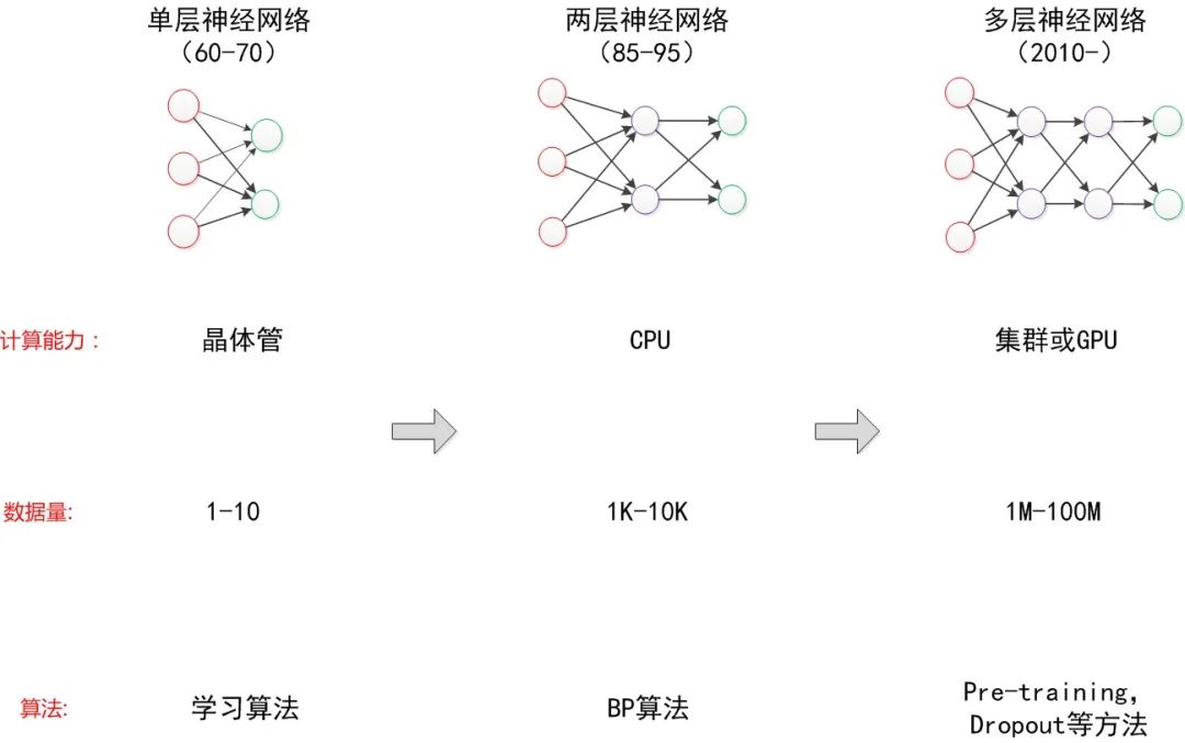 互联网时代,大量的数据被收集整理,更好的训练方法不断被发现。所有这一切都满足了多层神经网络发挥能力的条件。