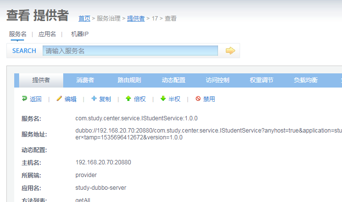 | dubbo://192.168.20.70:20880/com.study.center.service.IStudentService?anyhost=true&application=study-dubbo-server&dubbo=2.6.0&generic=false&interface=com.study.center.service.IStudentService&methods=getAll&pid=1652&revision=1.0.0&side=provider×tamp=1535696412672&version=1.0.0 |