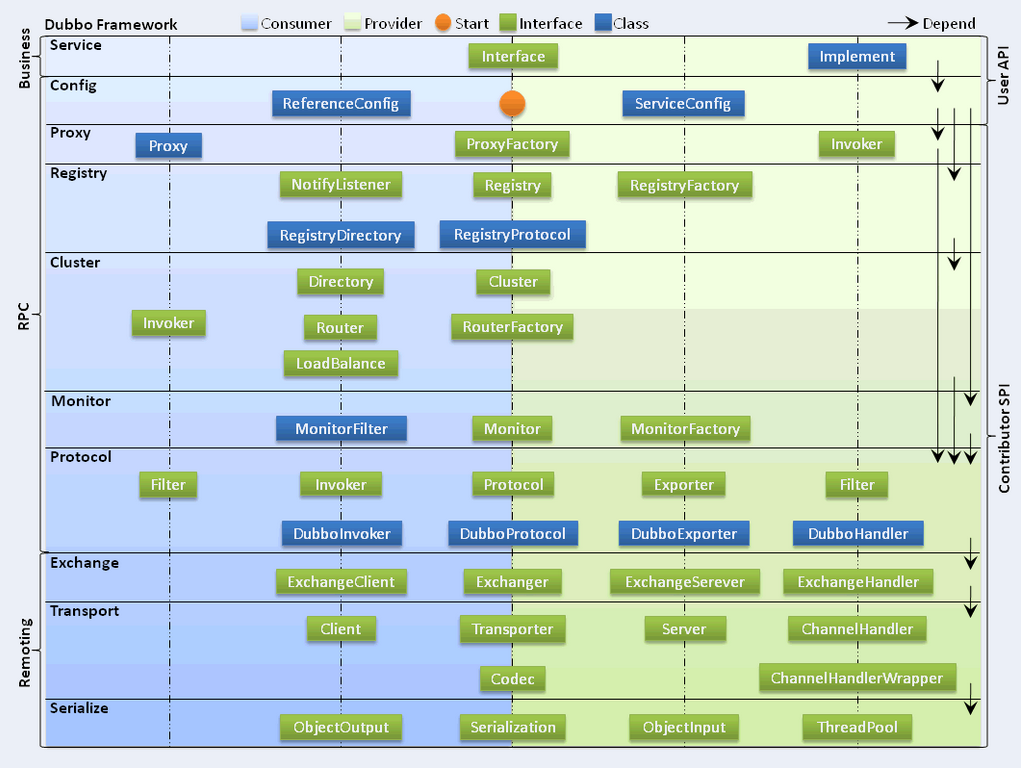- 图中的Consumer和Provider是抽象概念,只是想让看图者更直观的了解哪些类分属于客户端与服务器端,不用Client和Server的原因是Dubbo在很多场景下都使用Provider、Consumer、Registry、Monitor划分逻辑拓普节点,保持统一概念。