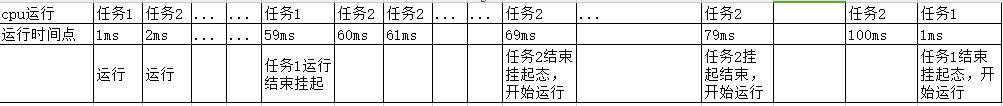 假如,任务1的延时时间是100ms,程序需要运行30ms,任务2的延时时间是50ms,程序需要运行40ms。那么cpu先在前60ms,间隔运行任务1、任务2,每次运行1ms,60ms后,任务1已经运行完毕,进入挂起态。任务2继续运行,运行到70ms后,任务2也运行完毕,进入挂起态,之后到80ms后重新运行任务2。