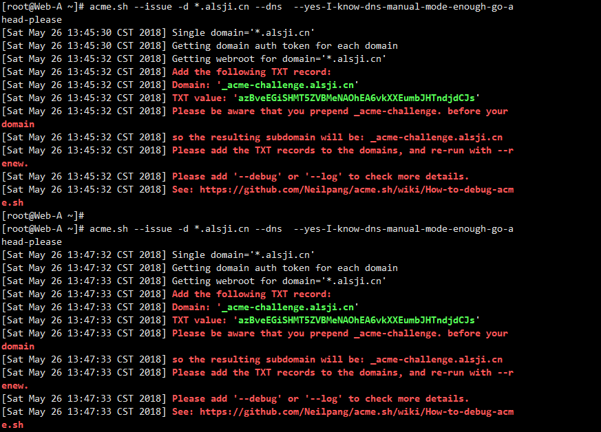 第一步获取验证DNS所需要的TXT记录,下面命令中两个“-d”建议先输入泛域名,这样在证书里可以显示*.alsji.cn这样的泛域名,显得比较吊一些。