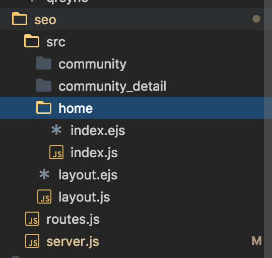 接下来就是写模板和对应的解析了, 新建一个home文件夹,文件夹下再建一个index.ejs和index.js