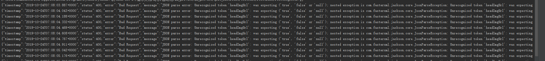 {"timestamp":"2019-10-24T07:08:04.043+0000","status":400,"error":"Bad Request","message":"JSON parse error: Unrecognized token 'headImgUrl': was expecting ('true', 'false' or 'null'); nested exception is com.fasterxml.jackson.core.JsonParseException: Unrecognized token 'headImgUrl': was expecting ('true', 'false' or 'null')\n at [Source: (PushbackInputStream); line: 1, column: 12]","path":"/family-web/robotBack/robotRegister"}