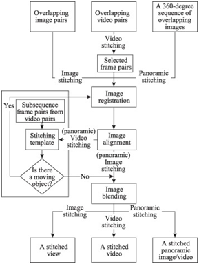 图像/视频拼接的主要目的是为了解决相机视野(FOV-Field Of View)限制,生成更宽的FOV图像/视频场景。视频拼接在体育直播、全景显示、数字娱乐、视频处理中都被广泛应用,同时视频/图像拼接涉及到矫正图像、对其与匹配图像、融合、统一光照、无缝连接、多尺度重建等各个图像算法模型与细节处理,可以说是图像处理技术的综合运用。特别是最近几年收到深度学习的影响,各种基于深度学习的图像对齐与拼接技术也取得了长足发展。