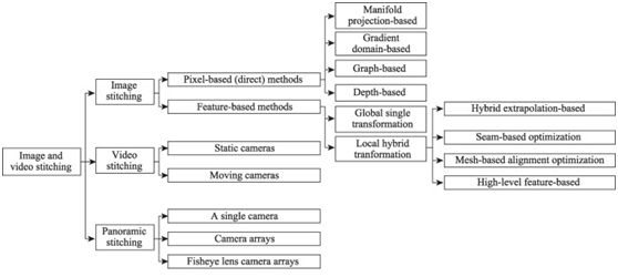 针对不同的拼接方式可以分为图像拼接、视频拼接、全景拼接。针对图像拼接可以分为像素相似与特征相似;视频拼接又分为固定相机、移动相机;全景拼接分为单相机、相机列阵、鱼眼相机列阵。图示如下: