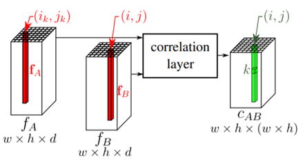 其中IA与IB是输入图像,CNN是预训练的特征提取网络模型,匹配网络与回归网络。其中匹配网络主要是计算相似程度,其网络计算方式如下: