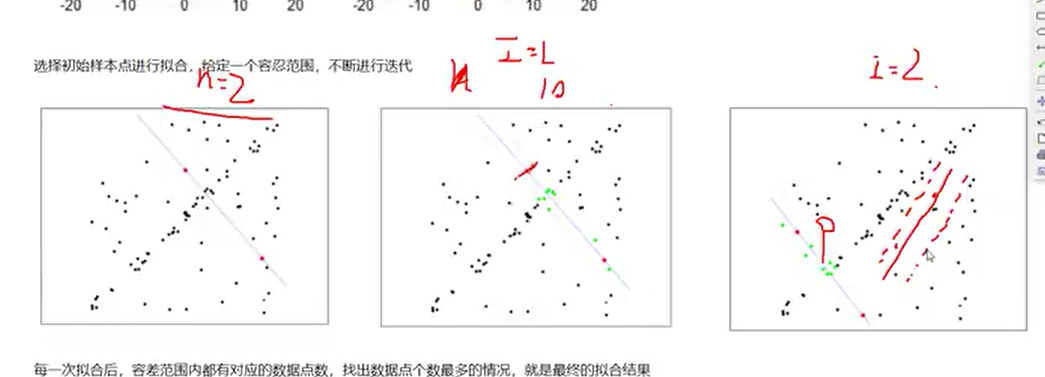 RANSCA原理, 因为拟合一条直线只需要两个点,因此我们每次随机选取两个点,做出直线,划定一个距离,判断落在直线周围距离范围点的个数,不断的迭代,直到找出拟合的直线,使得点落在上面最多的拟合曲线