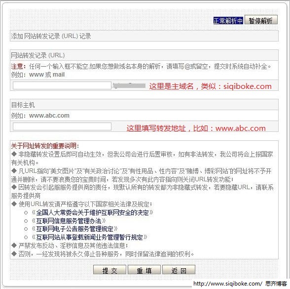 比如想把https://www.jb51.net转发到http://www.abc.com,则只需要在第一个框框里头填写www,下面填写www.abc.com即可。