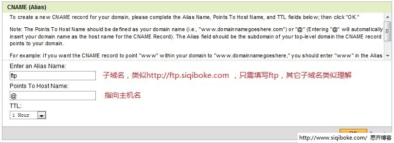 CNAME别名设置方法类似于A记录设置,比如要设置http://ftp.jb51.net,则只需要在Alias Name中填写ftp,Points to Host Name中填写别名地址即可,很多虚拟主机商一般都会在主机设置里同时提供IP和CNAME名,用户只需要根据实际情况,设置一个生效即可,比如要设置http://ftp.jb51.net到别名user1234.xxx.com,则只需要在Points to Host Name中添加user1234.xxx.com即可(在有些面板中可能最后还需要加个.号,有些会自动添加,这里就需要注意一下是否需要添加),下图中Points to Host Name值是@表示CNAME到默认的顶级域名地址(系统自动增加),只是个约定。