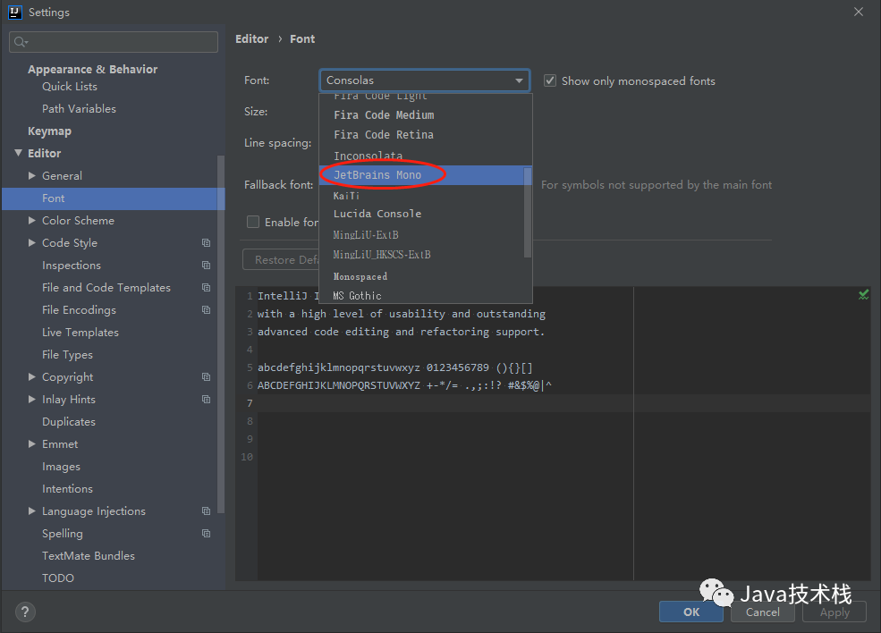 Preferences/Settings → Editor → Font, 然后选择 JetBrains Mono 字体。