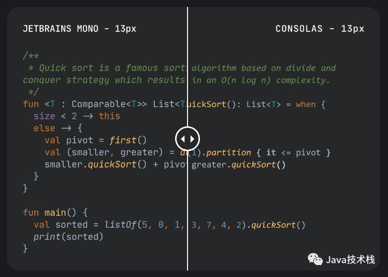 如果你说,没什么舒适不舒适的,差不多,你再来看下JetBrains Mono 和 Consolas 这两种字体的比较,应该明清晰了: