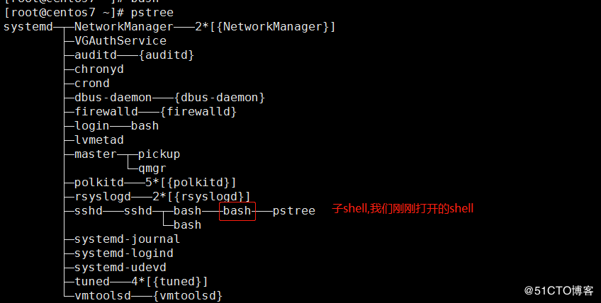 在0号使用#bash进入一个子shell,然后#pstree查看当前bash位置