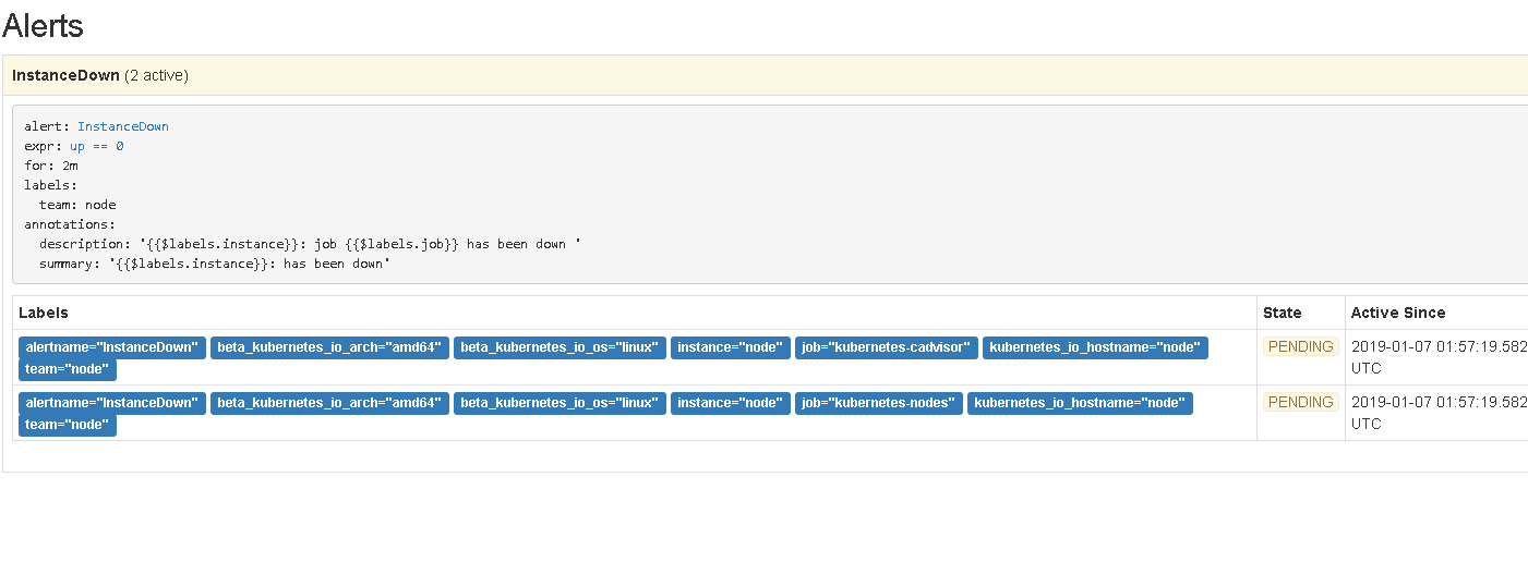 description: "{{$labels.instance}}: job {{$labels.job}} has been down "
