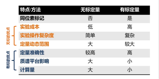 无标定量的试验成本低,适用不同平台数据相比较的情况,较有标定量动态范围大。有标定量受到质谱平台影响小,较为准确。