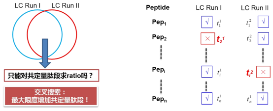 方法二是针对一级色谱的离子流色谱峰XIC,即每个肽段的离子流色谱峰,可以取同一个肽段不同时间点上的信号强度,连接成峰,通过求该曲线的曲线下面积获取曲线信息,通过采集同一个肽段的所有信息利用交叉搜索策略,相互比对后填补丢失量: