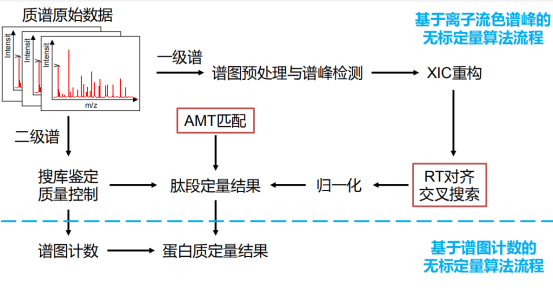 谱图计数速度快但是精度低和动态范围小,而XIC主要采用搜库能省时且准确,但特征比对就比较耗时。