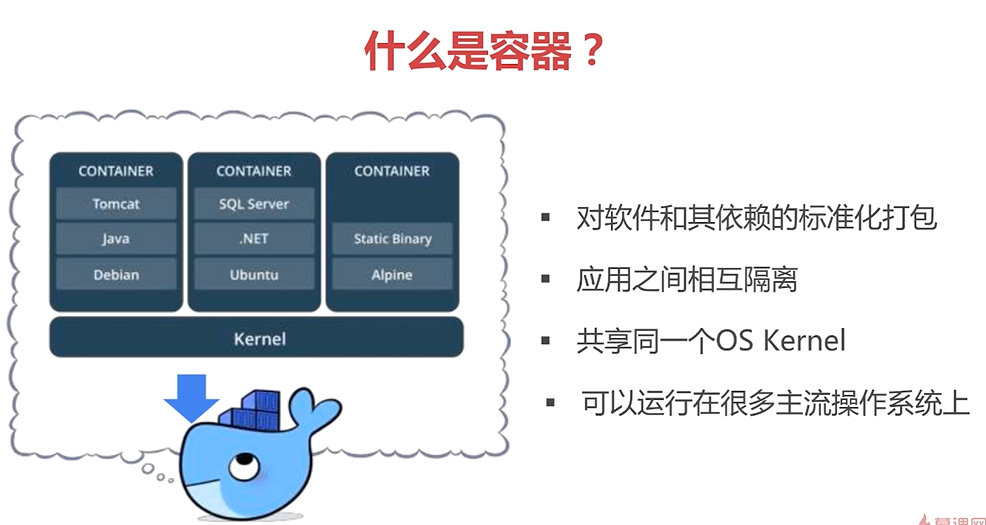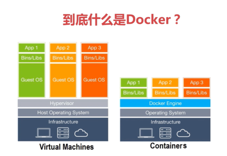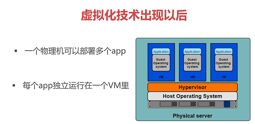 - 每一个虚拟机都是一个完整的操作系统,要给其分配资源,当虚拟机数量增多时,操作系统本身消耗的资源必增多