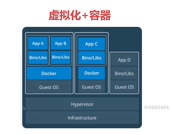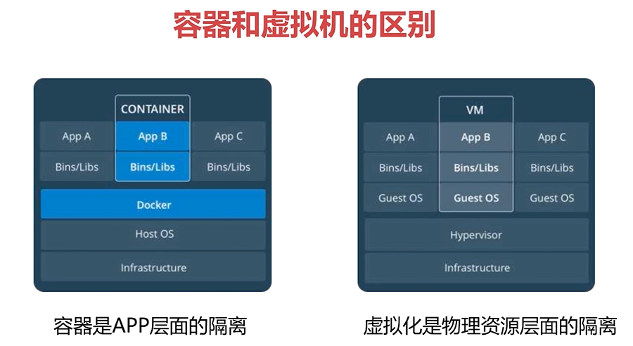 上图是虚拟机和容器的区别(让不同的应用运行在不同的虚拟机里面,实现了这个应用的隔离,容器技术同样也可以做到应用的隔离,而且它速度要比虚拟化技术要更方便更小巧)