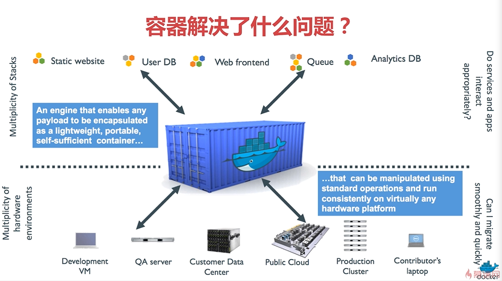 - 打包好的容器可以运行到任何的环境上的,这样就解决了开发和运维不在同一个环境上的问题