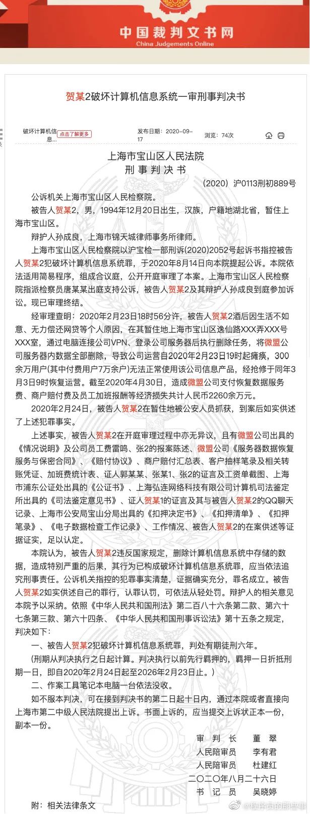据后来公开的裁判文书显示,犯罪嫌疑人贺某为微盟研发中心运维部核心运维人员。