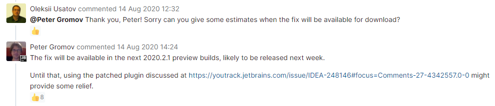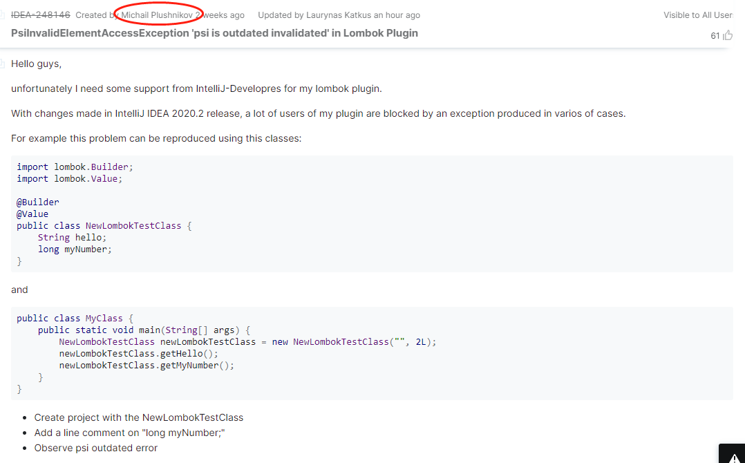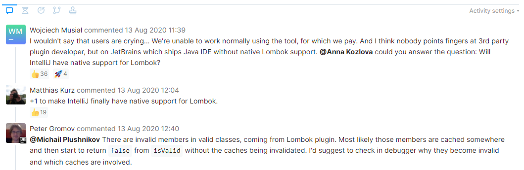 我不得不说,用户也在哭诉……我们无法使用该工具正常工作,为此,我们付出了代价。我认为,没有人会指责第三方插件开发者,反而是 JetBrains 公司发开发的 Java IDE,没有提供对原生 Lombok 插件的支持。