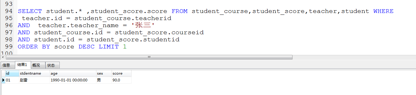 SELECT student.* ,student_score.score FROM student_course,student_score,teacher,student WHERE