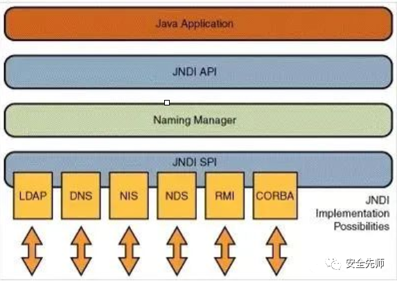 在Java Name Directory Interface中,Java的命名和目录接口(JNDI)是一种Java 的API,类似于一个索引中心,允许客户端通过name发现和查找数据。JNDI包括Naming Service和Directory Service,此时,通过名称来寻找数据和对象的API,我们也称其中为一种绑定。但是JNDI可访问的现有的目录及服务有:JDBC、LDAP、RMI、DNS、NIS、CORBA。