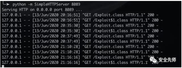 此时将编译好的Exploit.class 放在web目录下并开启服务
