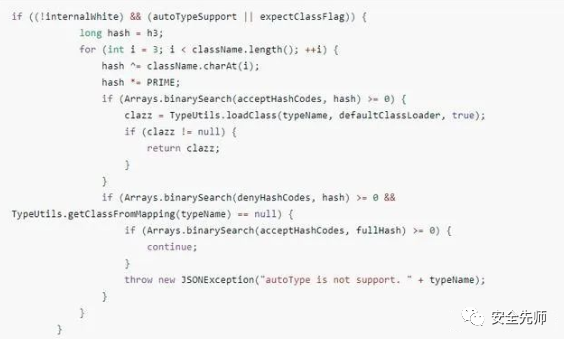 具体代码如下图所示,在 public Class<?> checkAutoType(String typeName, Class<?> expectClass, int features) 函数中有对应处理。黑名单hash生成算法,大概思路是将每一位都异或进行异或叠加。