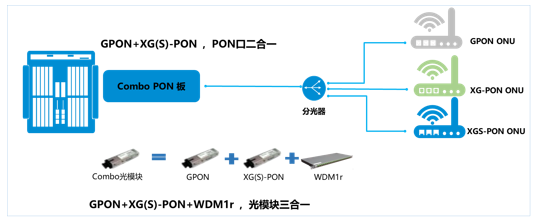 Combo-PON是通过三合一光模块,在内部集成了GPON光模块、10G PON光模块和WDM1r合波器。这样一来,不论用户侧接GPON ONT还是10G PON ONT,都可以正常工作,有利于升级过渡。