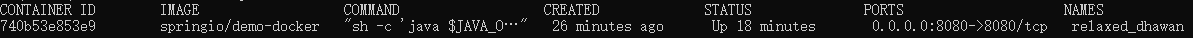 NAMES 表示容器名称,该名称默认由Docker自动生成,也可使用docker run 命令的 -name 选项自行指定