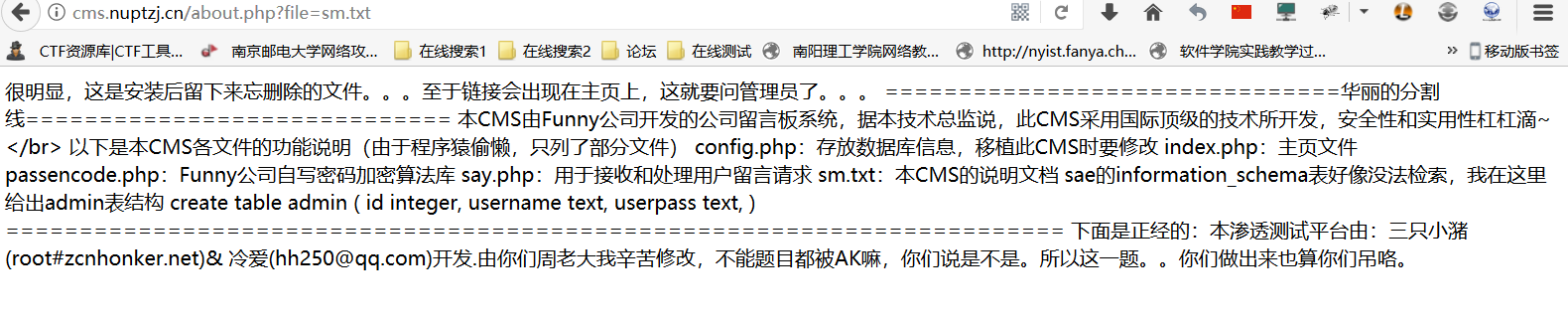 根据这个sm.txt , 我们可以得到好多消息,config.php:存放数据库信息,移植此CMS时要修改 index.php:主页文件 passencode.php:Funny公司自写密码加密算法库 say.php:用于接收和处理用户留言请求 sm.txt:本CMS的说明文档 sae的information_schema表好像没法检索,我在这里给出admin表结构 create table admin ( id integer, username text, userpass text, ),表名 : admin 字段名 :username , userpass