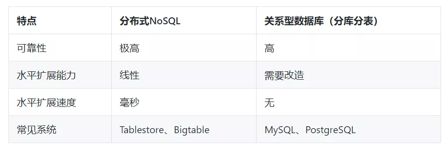 水平扩展能力:对于分布式NoSQL数据库,数据天然是分布在多台机器上,当一台机器上的数据量增大后,可以通过自动分裂两部分,然后将其中一半的数据迁移到另一台机器上去,这样就做到了线性扩展。而关系型数据库需要在扩容时再次分库分表。