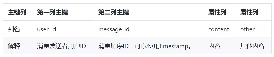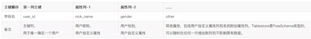 如果使用NoSQL数据库Tablestore,那么用户详情表设计结构如下:
