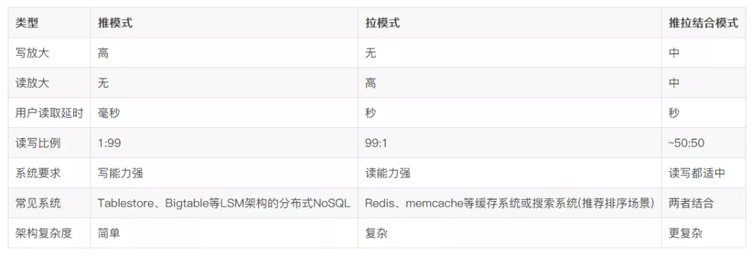 如果产品是单向关系,单用户数大于1000万,那么采用推拉结合模式,这时候可以从推模式演进过来,不需要额外重新推翻重做。
