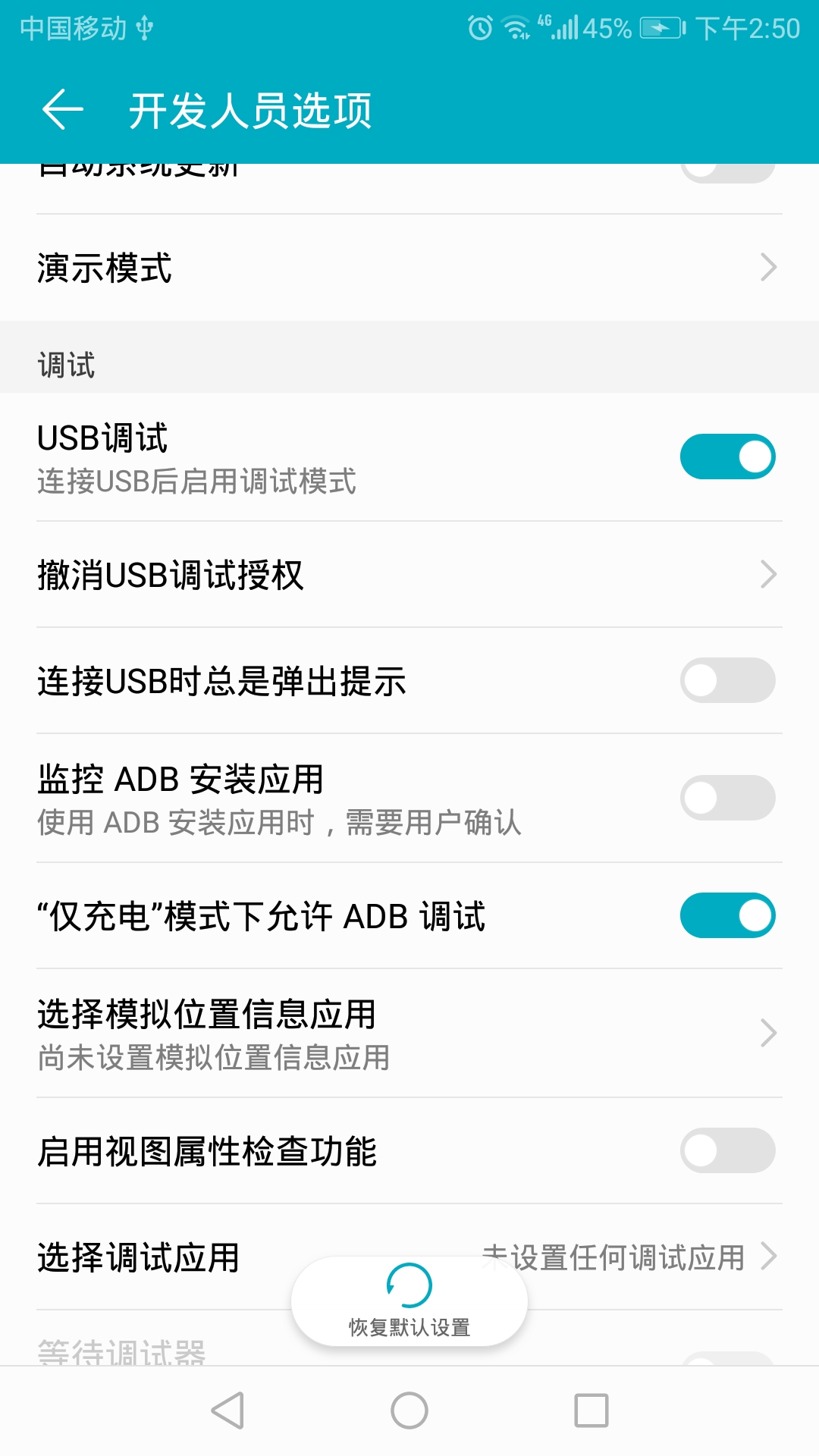 3、华为手机,打开USB调试和仅充电模式下允许ADB调试。如下图所示: