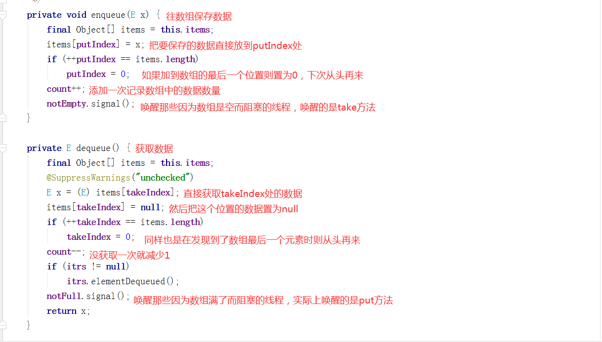 put获取到锁,如果数组已满则调用notFull.await一直阻塞等待唤醒,唤醒后再次验证是否已满,没满则调用enqueue,否则再次阻塞。所以向队列中加数据只有put方法才支持真正的阻塞,保证添加成功,其他方法会可能保存失败。