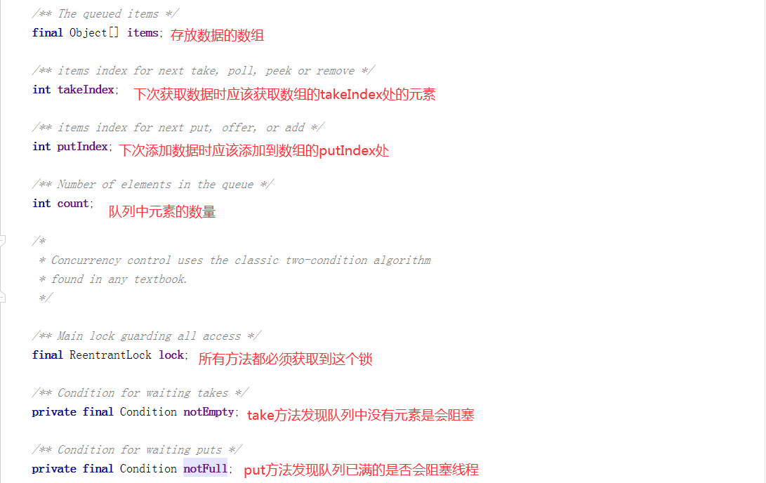 ArrayBlockingQueue的属性还是比较简单,首先是存放数据的Object数组,它是final修饰的,所以队列的长度不可变。