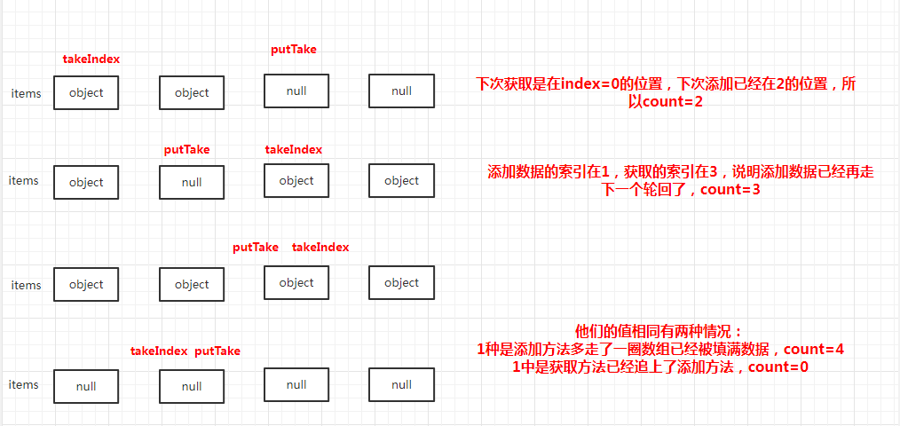 所以主要的变化在于putIndex和takeIndex,这里总结了他们有如下4种关系: