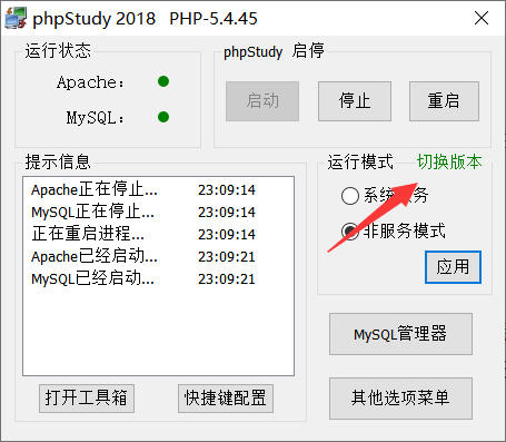 然后用存在漏洞的PHP版本进行启动服务,我使用的是5.4.45,切换版本的位置如图