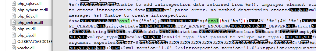 找到目录下的php_xmlrpc.dll文件,用文本打开,搜索eval关键字: