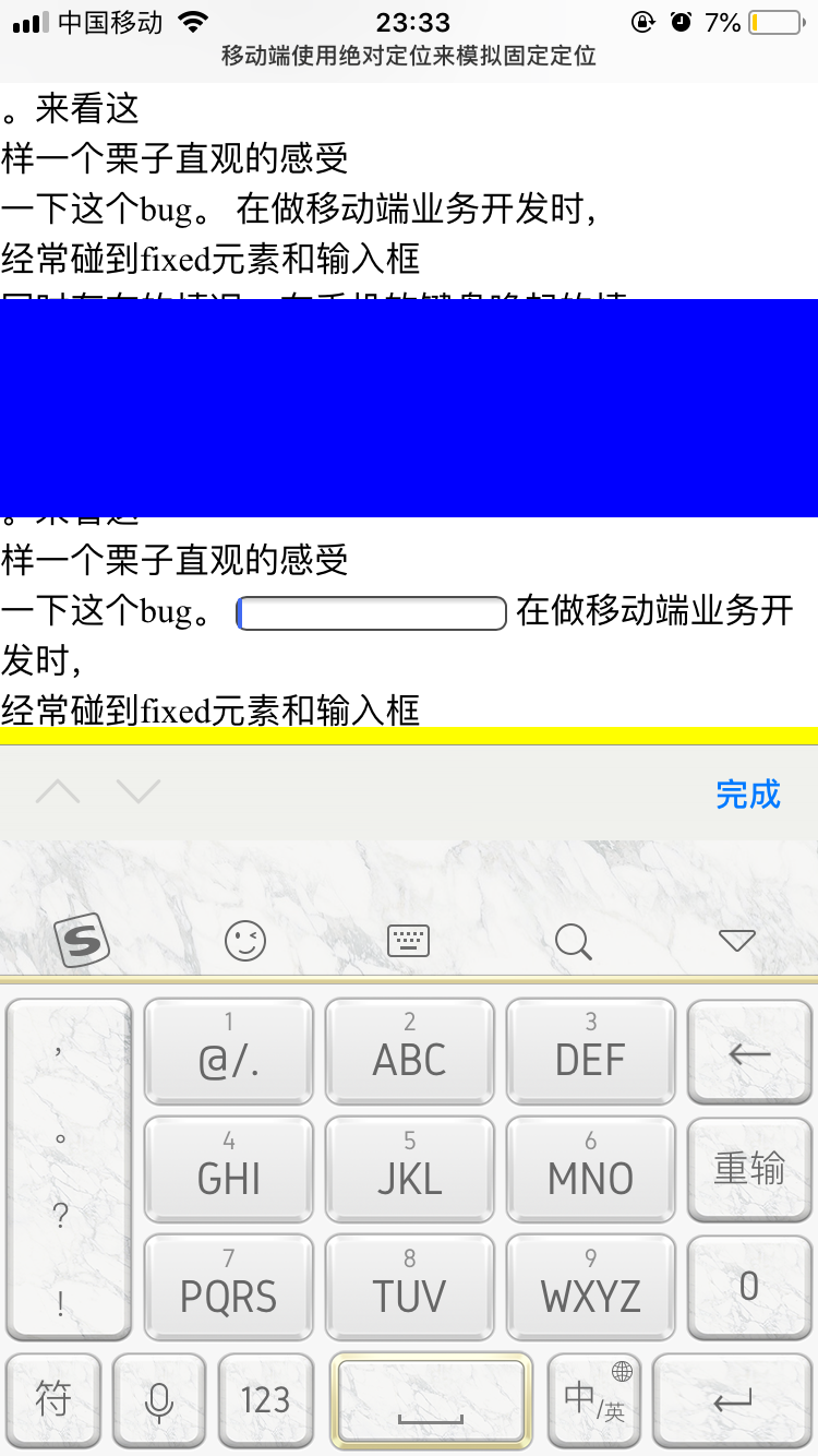 在做移动端业务开发时,<br/>经常碰到fixed元素和输入框<br/>同时存在的情况。在手机软键盘唤起的情<br/>况下,会造成原本<br/>fixed定位的元素跟随软键盘而<br/>上浮,对整体布局造成冲击<br/>。来看这<br/>样一个栗子直观的感受<br/>一下这个bug。