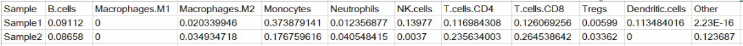 第一个文件为每个样本中基因的TPM表达量,第二个文件为每个样本中免疫细胞组分的定量结果,内容示意如下
